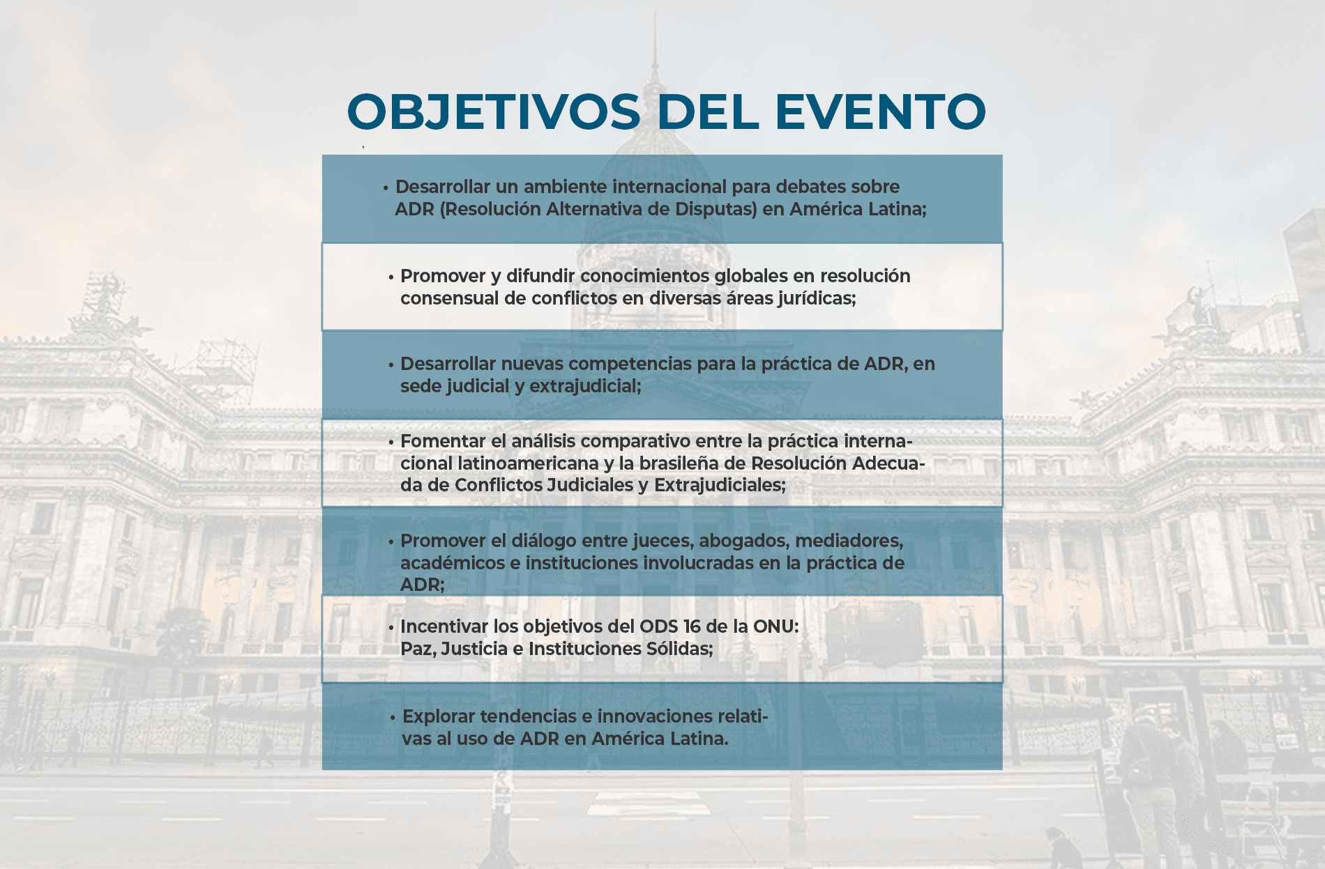 El evento busca desarrollar un ambiente internacional para debatir los ADR (Métodos Alternativos de Resolución de Disputas) en América Latina, diseminar conocimientos globales en resolución consensual de conflictos, desarrollar nuevas competencias en ADR y promover el diálogo entre profesionales del área, además de incentivar los objetivos del ODS 16 de la ONU (Paz, Justicia e Instituciones eficaces).