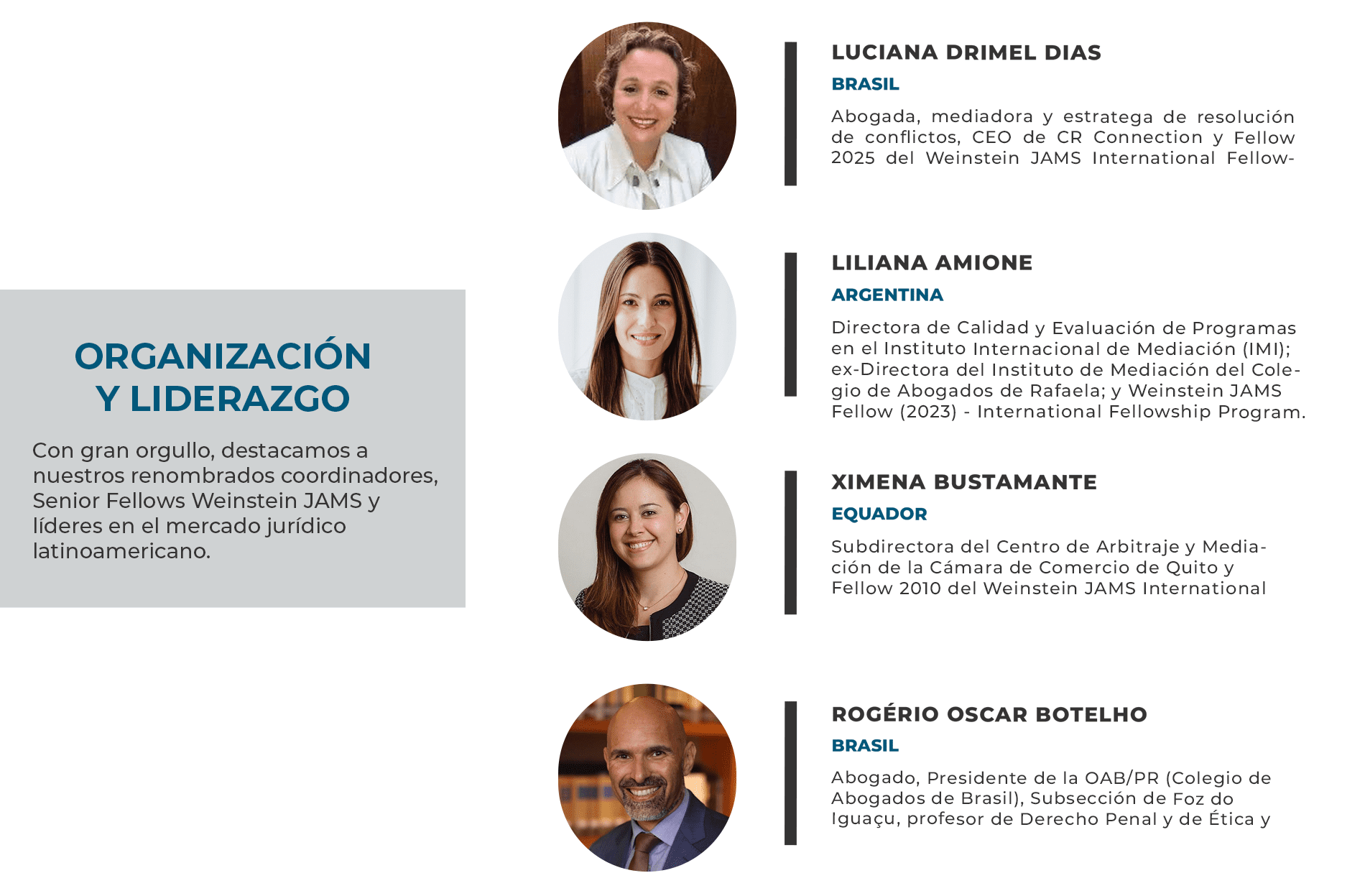 La organización y liderazgo destacan coordinadores de renombre y Fellows Weinstein JAMS, como Luciana Drimel Dias (Brasil), Liliana Amione (Argentina), Ximena Bustamante (Ecuador) y Rogério Oscar Botelho (Brasil).