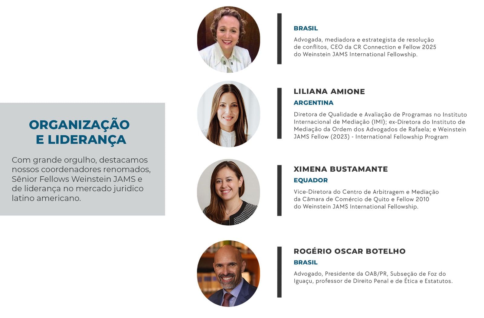 A organização e liderança destacam coordenadores renomados e Fellows Weinstein JAMS, como Luciana Drimel Dias (Brasil), Liliana Amione (Argentina), Ximena Bustamante (Equador) e Rogério Oscar Botelho (Brasil).