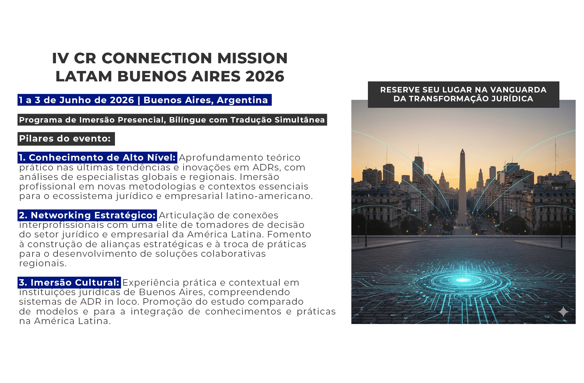 É um Programa de Imersão Presencial e Bilíngue com Tradução Simultânea focado em Mediação, Negociação e Arbitragem, com o tema central de "CONEXÕES ESTRATÉGICAS: RESOLUÇÃO DE CONFLITOS NA ERA DIGITAL E DESENVOLVIMENTO SUSTENTÁVEL NA AMÉRICA LATINA".