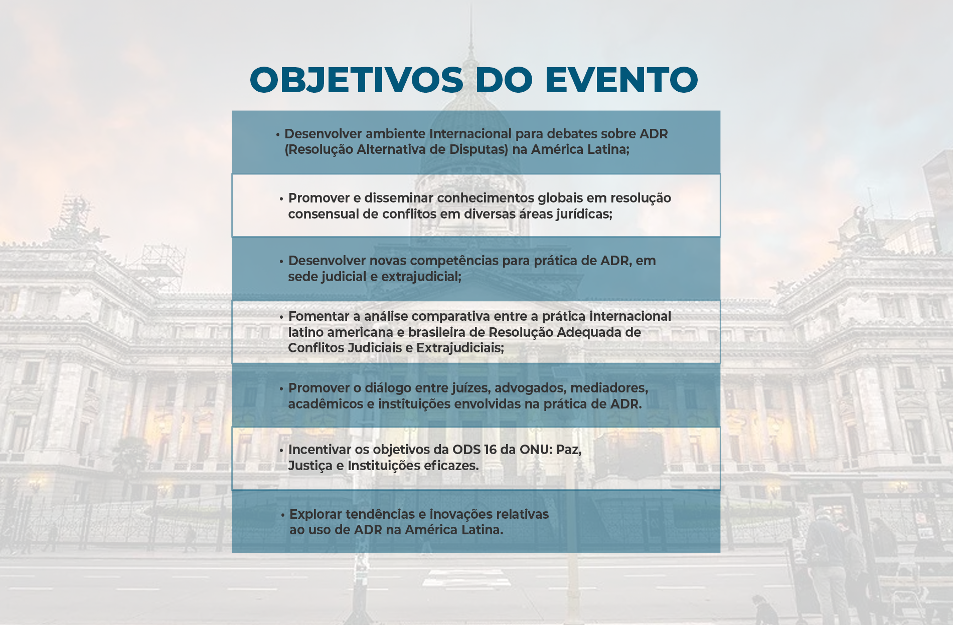 O evento visa desenvolver um ambiente internacional para debater ADR na América Latina, disseminar conhecimentos globais em resolução consensual de conflitos, desenvolver novas competências em ADR e promover o diálogo entre profissionais da área, além de incentivar os objetivos da ODS 16 da ONU (Paz, Justiça e Instituições eficazes).