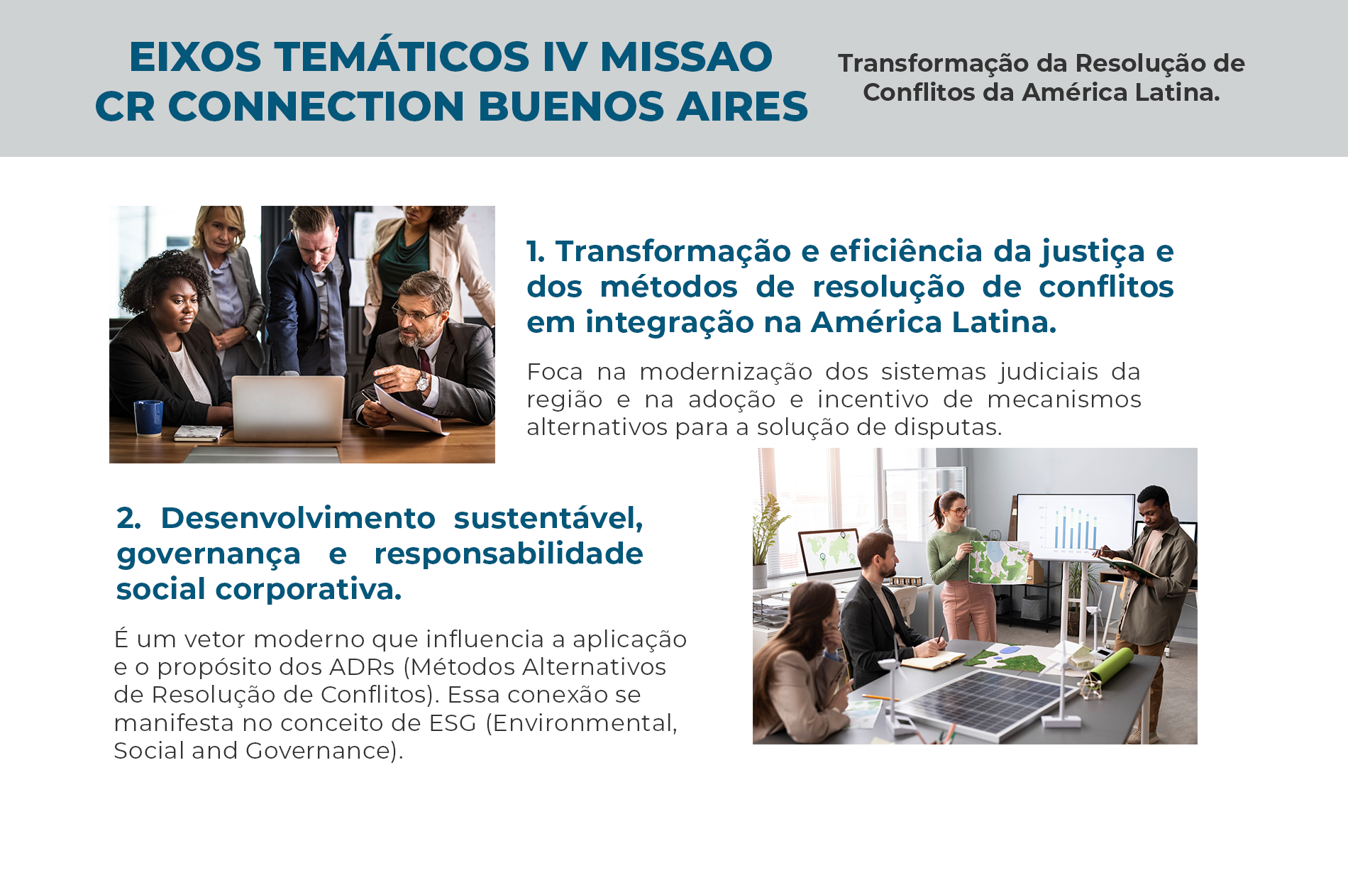 Os eixos temáticos incluem: 1. Transformação e eficiência da justiça e dos métodos de resolução de conflitos na integração na América Latina, 2. Desenvolvimento sustentável, governança e responsabilidade social corporativa, 3. Inovação, tecnologia e novas fronteiras em ADRs, e 4. Aplicação prática das ADR na América Latina.